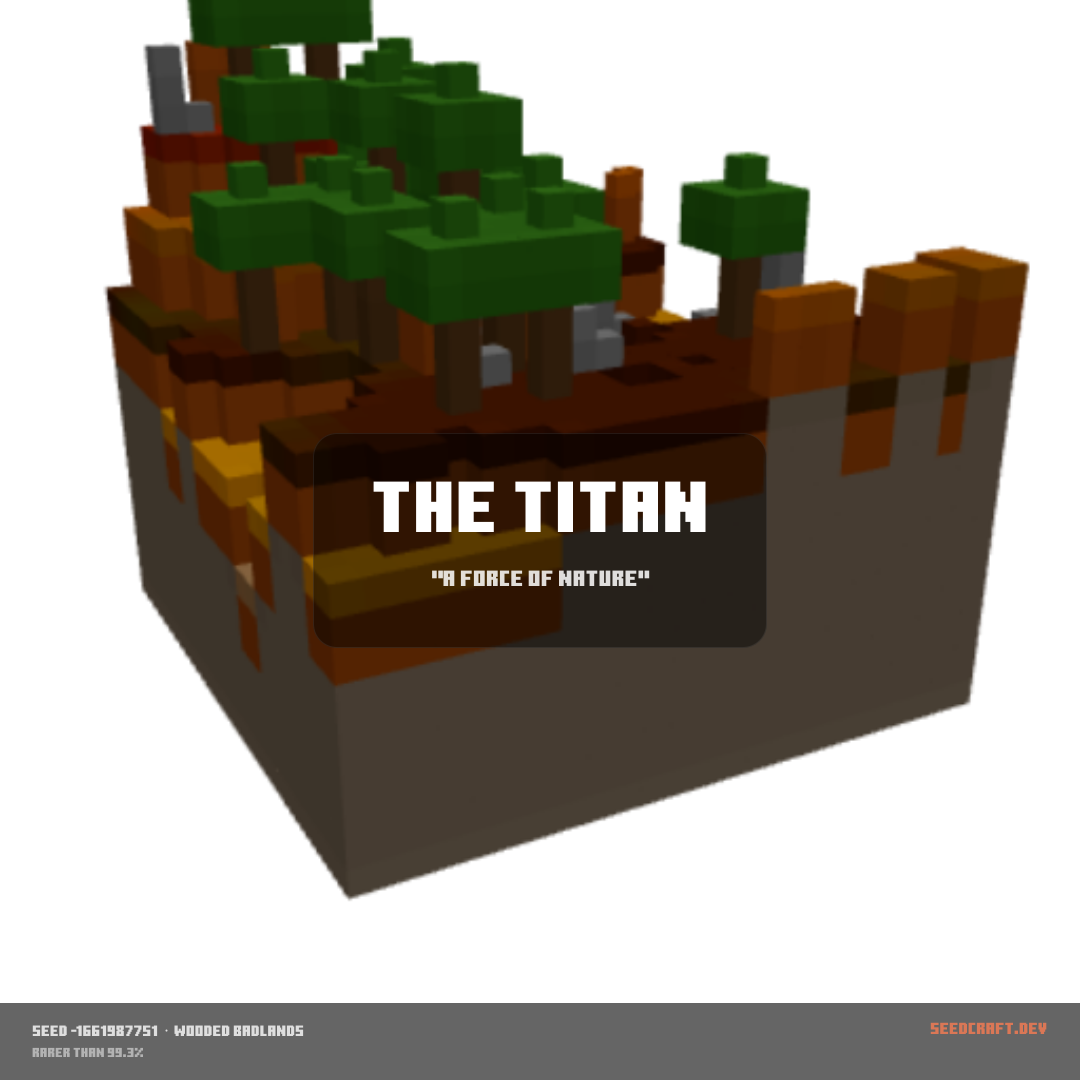 Terracotta mesas crowned with forests — among the rarest biomes in the game. Your intense coding forged a legendary world.